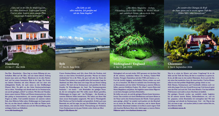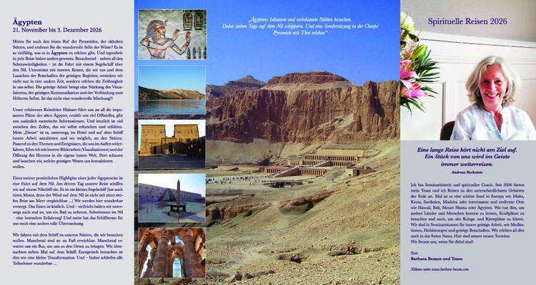 Mehr Informationen über die Seminare, Reisen und Zoom-Webinare bekommen Sie unter: info@barbara-bessen.com oder www.barbara-bessen.com